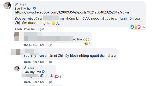 Tuy nhiên, một số cư dân mạng lại thể hiện sự kém duyên khi thả biểu cảm "haha" dưới bài đăng tâm trạng của Bảo Thy. Sau khi được người hâm mộ nhắc về điều này, Bảo Thy đã thẳng tay chặn hết những người thể hiện thái độ cợt nhả, thiếu tôn trọng trong bài đăng chia buồn của cô.