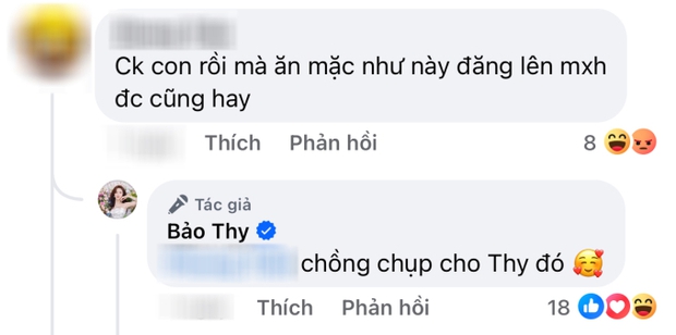 Đáng chú ý, một tài khoản bất ngờ để lại nhận xét gay gắt về việc Bảo Thy diện bikini dù đã có chồng con. Cụ thể, người này mỉa mai: "Chồng con rồi mà ăn mặc như này lên mạng xã hội được cũng hay". Ngay sau đó, cô liền trả lời ngay: "Chồng chụp cho Thy đó". Màn đáp trả đầy khôn khéo của Bảo Thy cũng đã nhận được nhiều lời khen.
