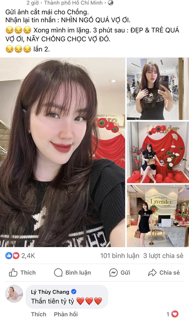 Kèm theo đó, nữ ca sĩ sinh năm 1988 cho biết cô đã chụp hình lại khoe mái tóc mới với ông xã. Tuy nhiên ông xã doanh nhân đã trả lời tin nhắn khiến Bảo Thy "sững người": "Nhìn ngố quá vợ ơi". Sau khi thấy bà xã im lặng 3 phút, doanh nhân Phan Lĩnh liền khéo léo nịnh: "Đẹp và trẻ quá vợ ơi. Nãy chồng chọc vợ đó". Bảo Thy còn tiết lộ ông xã sau đó đã đăng tải hình ảnh chụp tình tứ bên cô và bày tỏ tình cảm: "I love you" (Tạm dịch: Anh yêu em). Chỉ qua bài đăng này, netizen đã thấy vị thế chuẩn "nóc nhà" quyền lực của Bảo Thy.