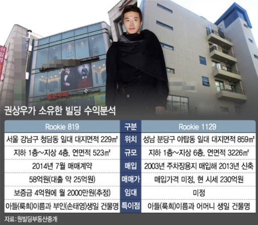 Vào khoảng đầu tháng 1/2020, trong một chương trình truyền hình, Kwon Sang Woo đã tiết lộ tất cả những bất động sản mà anh đang nắm giữ hiện lên tới con số 70 tỷ Won (hơn 1.300 tỷ đồng). Theo đó, sau khi cùng Son Tae Young kết hôn, Kwon Sang Woo đã cho xây dựng một tòa nhà 7 tầng (gồm 1 tầng hầm) tại Bundang, Seongnam trị giá 20 tỷ won (378 tỷ đồng), được đặt tên theo họ nam diễn viên và dành tặng cho sinh nhật của mẹ và con trai Kwon Sang Woo.