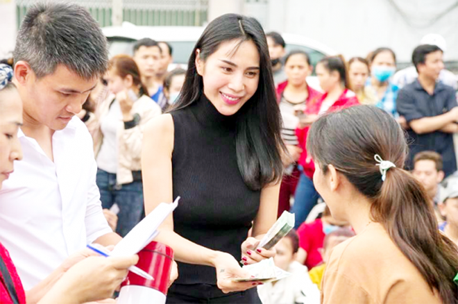 Những ngày đó, cô không ngại xắn quần lội nước đến những khu vực nguy hiểm để trao quà. Trước đây, việc cô đội nắng, xe máy để đi từ thiện diễn ra thường xuyên.