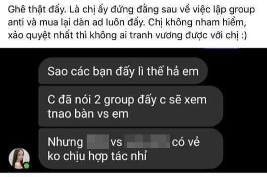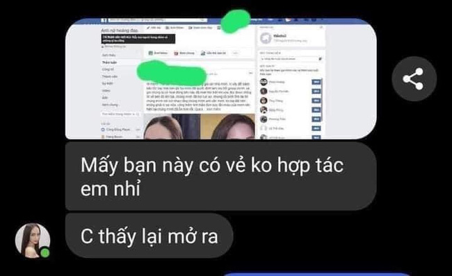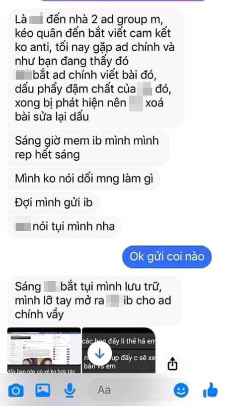 Ở đoạn tin nhắn người này có nói chuyện với một người khác về chuyện Hương Giang tới tận nhà admin chính để ép viết bản cam kết: "Là… đến nhà 2 admin group, kéo quân đến bắt viết cam kết không anti, tối nay gặp admin chính và như bạn thấy đó… bắt admin chính viết bài đó, dấu phẩy đậm chất… đó, xong bị phát hiện nên… xóa bài sửa lại dấu".