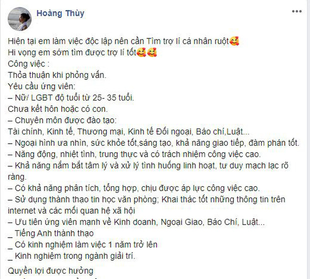 Trước đó, Hoàng Thùy từng gây tranh cãi khi đề ra một loạt yêu cầu tuyển trợ lý hết sức phức tạp. Từ độ tuổi, bằng cấp, kỹ năng chuyên ngành, cho đến ngoại hình, ngôn ngữ... đều là những yếu tố mà nữ siêu mẫu quan tâm ở người trợ lý tương lai của mình. Tuy nhiên, nói đi cũng phải nói lại, dù yêu cầu của Hoàng Thùy có cụ thể và gây hoang mang như thế nào cũng không thể "bá đạo" bằng BB Trần.