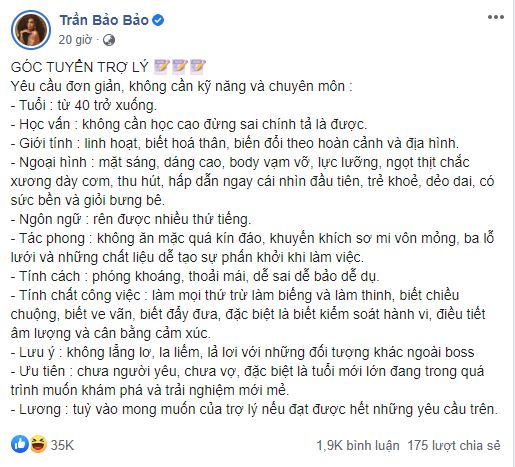 "Body vạm vỡ, lực lưỡng, ngọt thịt chắc xương dày cơm, hấp dẫn ngay từ cái nhìn đầu tiên, trẻ khỏe, deo dai", "không ăn mặc quá kín đáo, khuyến khích sơ mi vôn mỏng, ba lỗ lưới và những chất liệu dễ tạo sự phấn khởi khi làm việc",... Nhìn loạt tiêu chí này, không chỉ dân mạng mà đông đảo sao Việt cũng ngỡ BB Trần đang tuyển người yêu chứ không phải tuyển trợ lý.