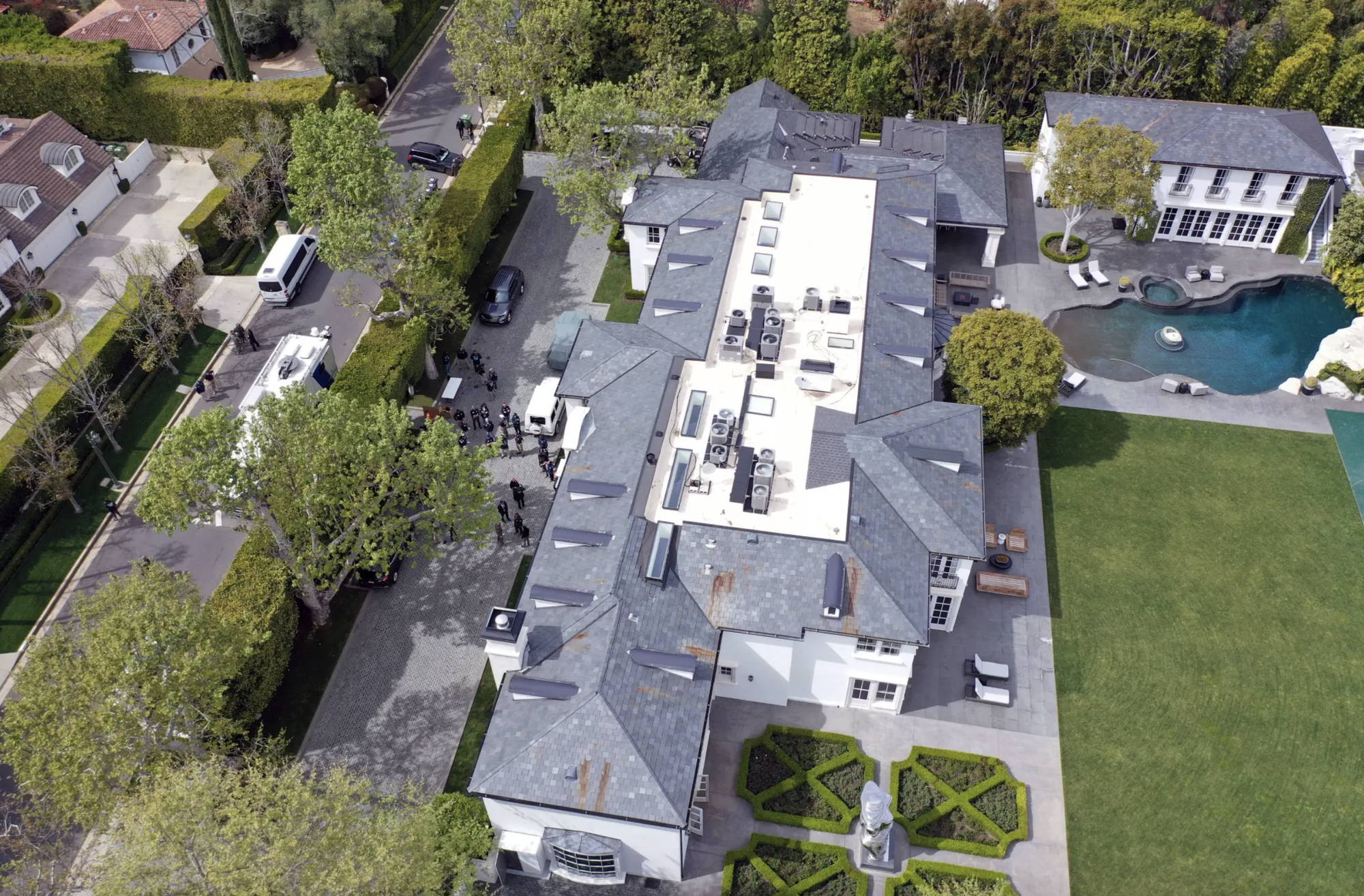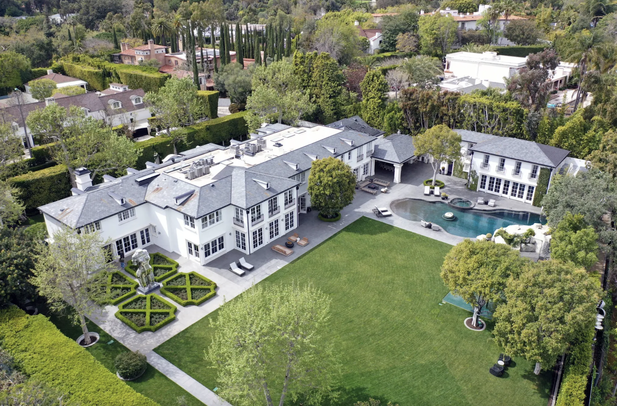 Trong khuôn viên có hồ bơi lớn, sân bóng rổ, nhà khách 2 tầng và khu vườn được cắt tỉa cẩn thận.