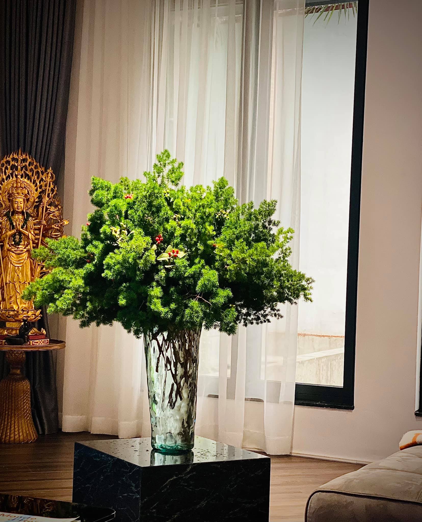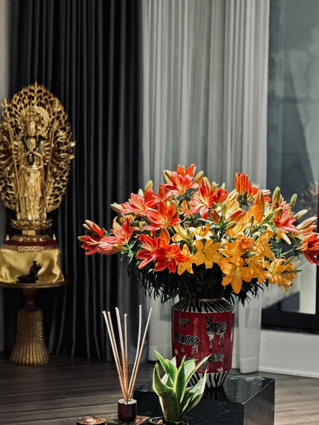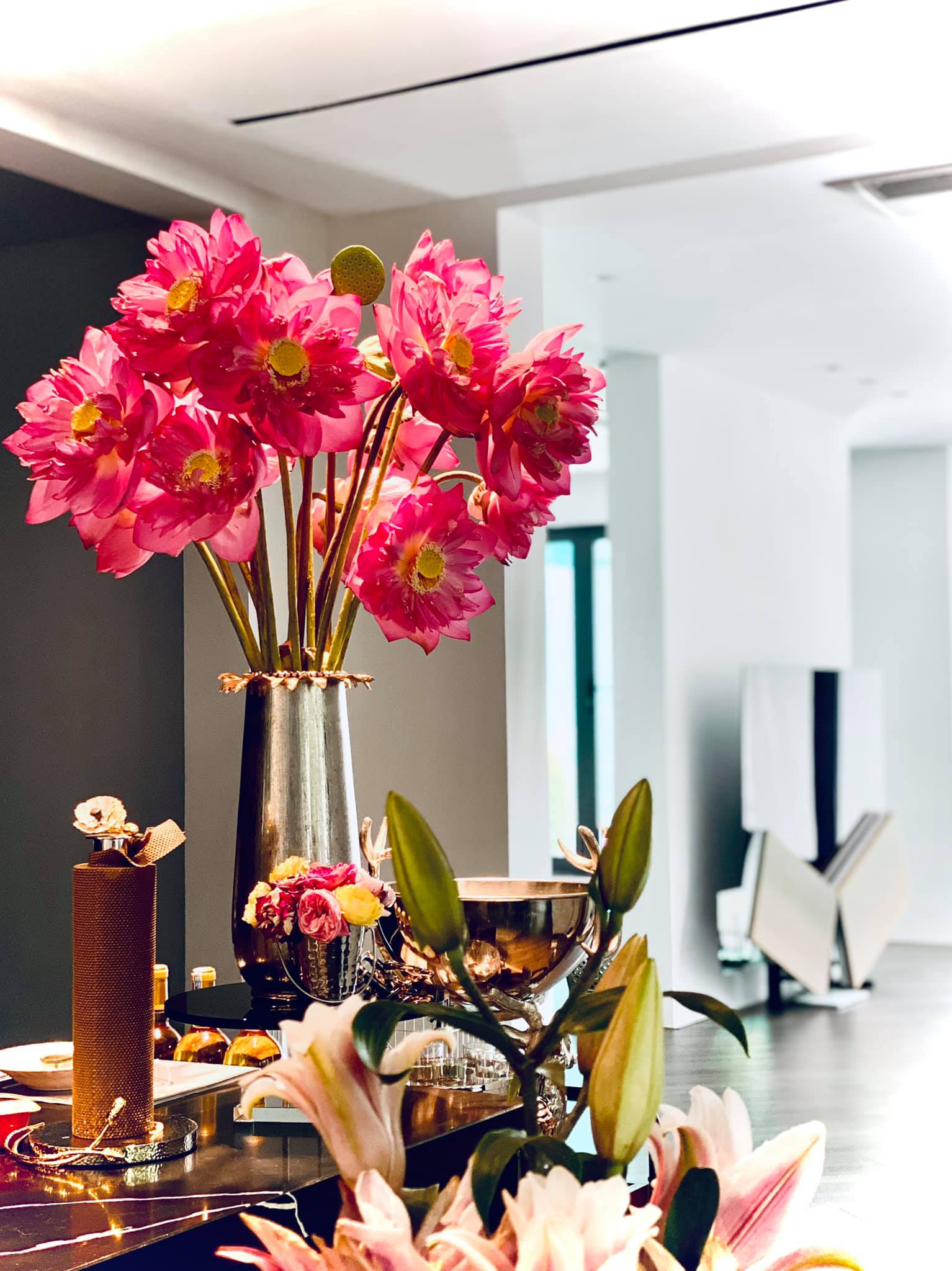 Biệt thự của BTV Ngọc Trinh vốn có thiết kế sang xịn, nhưng để không gian thêm bắt mắt và ngập tràn sức sống, ngoài việc trang trí thêm tranh, đồ nội thất, đồ decor,... cô còn trưng rất nhiều hoa tươi trong nhà. Trên trang cá nhân, Ngọc Trinh khiến khán giả trầm trồ trước khả năng cắm hoa khéo léo của bản thân. Từ hình ảnh mà cô chia sẻ, có thể thấy mỗi một không gian lại được nữ BTV đặt một bình hoa xinh xắn với kiểu dáng và màu sắc khác nhau, khi là hoa hồng, hoa dơn,... lúc là hoa sen trắng tinh tế và trang nhã.
