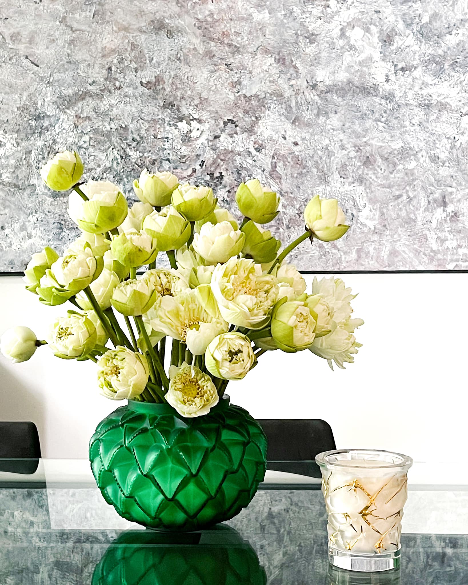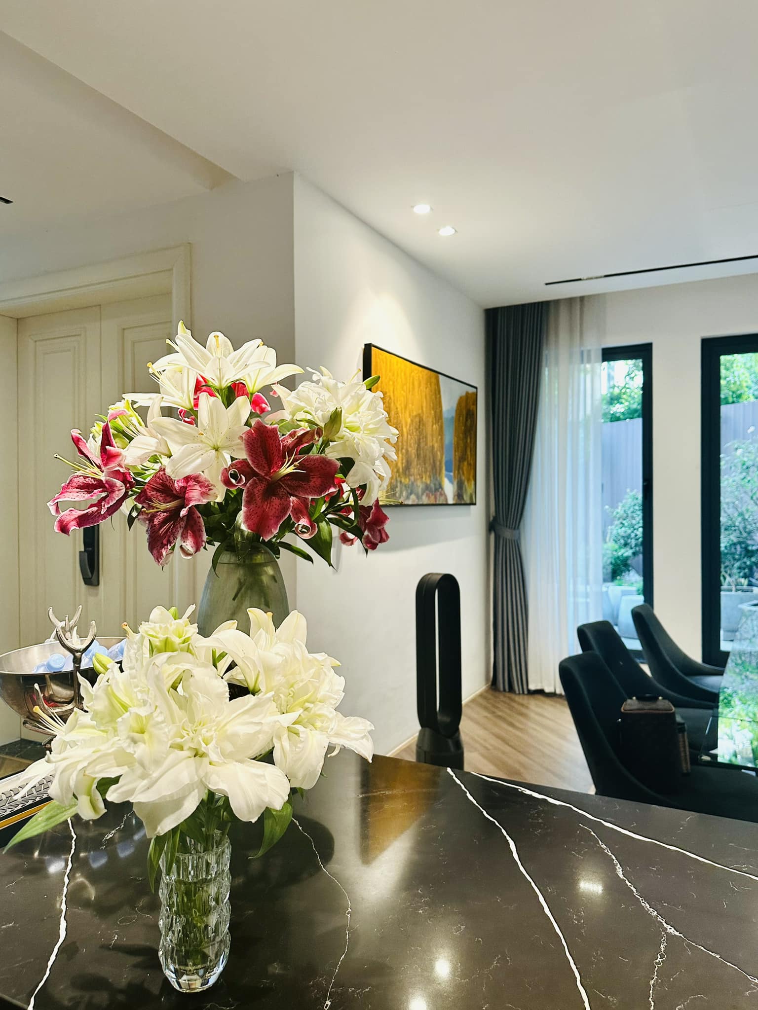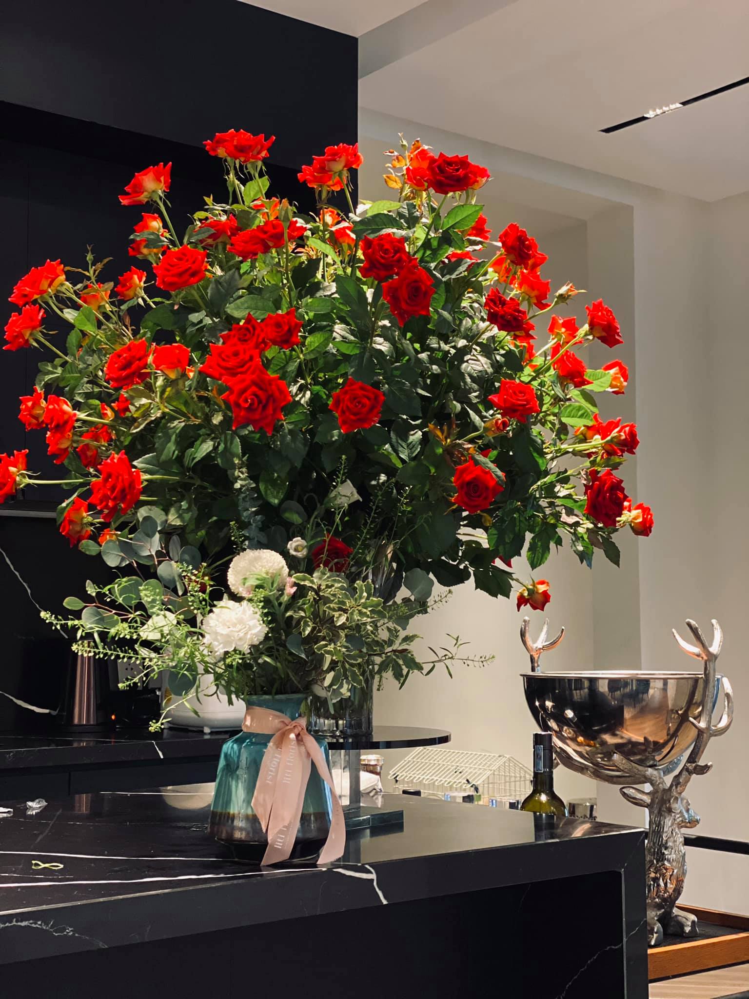 Biệt thự của BTV Ngọc Trinh vốn có thiết kế sang xịn, nhưng để không gian thêm bắt mắt và ngập tràn sức sống, ngoài việc trang trí thêm tranh, đồ nội thất, đồ decor,... cô còn trưng rất nhiều hoa tươi trong nhà. Trên trang cá nhân, Ngọc Trinh khiến khán giả trầm trồ trước khả năng cắm hoa khéo léo của bản thân. Từ hình ảnh mà cô chia sẻ, có thể thấy mỗi một không gian lại được nữ BTV đặt một bình hoa xinh xắn với kiểu dáng và màu sắc khác nhau, khi là hoa hồng, hoa dơn,... lúc là hoa sen trắng tinh tế và trang nhã.