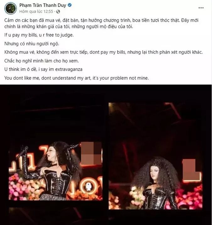 Anh viết: "... Có nhiều người ngộ. Không mua vé, không đến xem trực tiếp. Don't pay my bills (tạm dịch: Không trả tiền cho những đêm diễn của tôi) nhưng lại thích phán xét người khác. Chắc họ nghĩ mình làm cho họ xem.