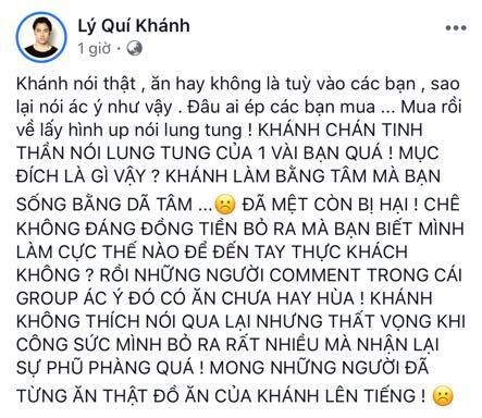 Khánh không thích nói qua lại nhưng công sức mình bỏ ra rất nhiều mà nhận lại sự phũ phàng quá! Mong những người từng ăn đồ ăn thật của Khánh lên tiếng!", Lý Quí Khánh viết.