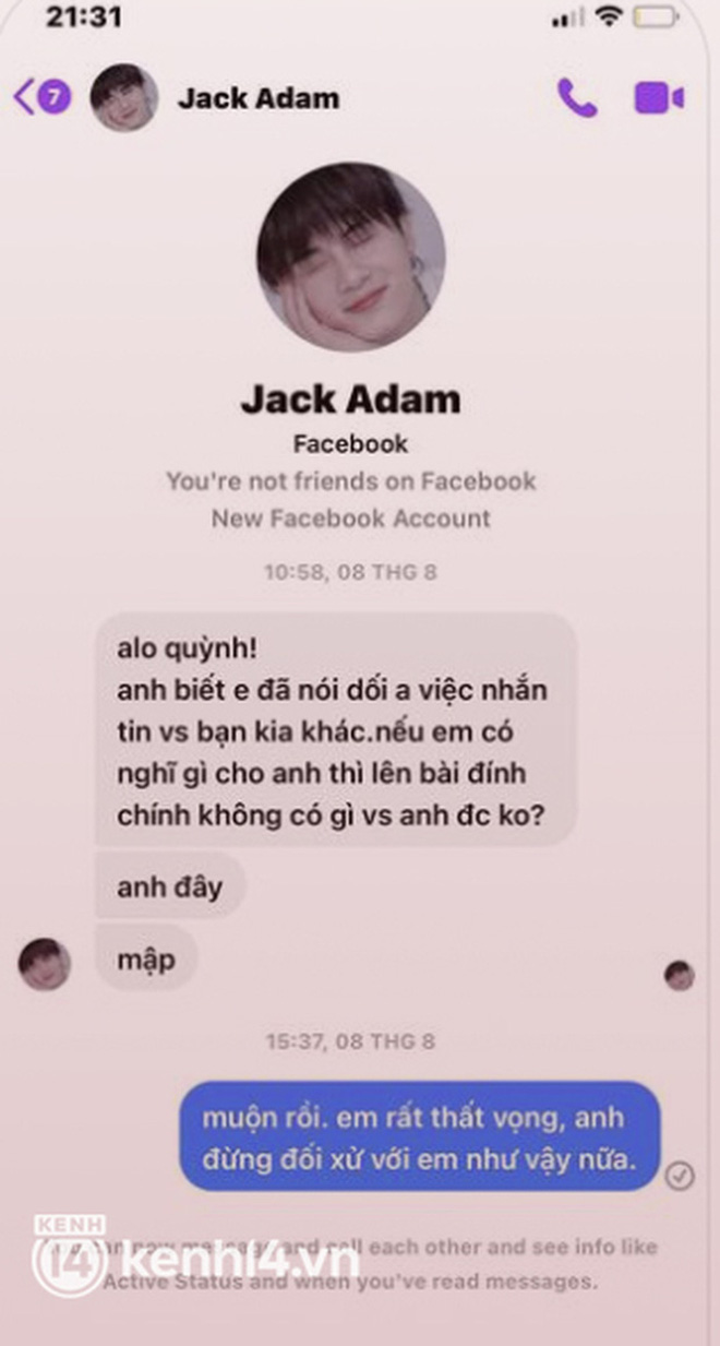 Cụ thể hơn, chia sẻ với chúng tôi, nhân vật tên L.T.Q xác nhận có 1 tin nhắn được cho là của nam ca sĩ Sóng Gió gửi sau khi có liên hoàn biến trên MXH với nội dung: "Anh biết em đã nói dối chuyện anh nhắn tin với bạn kia khác. Nếu em có nghĩ gì cho anh thì hãy lên bài đính chính giúp anh được không. Anh đây, Mập". Trước đó, L.T.Q cũng đã đăng 1 bức hình tin nhắn được cho là với Jack lên story MXH.