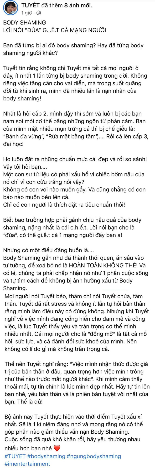 Thời điểm đó, khi chia sẻ những hình ảnh hậu trường phim lên MXH, Tuyết đã nhận về không ít bình luận miệt thị ngoại hình. Rất nhiều lời công kích ác ý nhắm thẳng vào cô như: "Chửa à", "Béo bệnh", "Bị bỏ bùa à?", "Có mắc bệnh tâm lý gì không?"... khiến Tuyết bị tổn thương nặng nề.