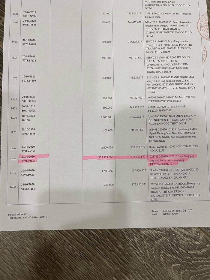 Theo đó, cô viết trên trang cá nhân nội dung: "Với vấn đề kêu gọi từ thiện, sau khi Sam tổng kết đợt quyên góp đó, nếu như các bạn có theo dõi sẽ thấy sau đó Sam đã sao kê online post lên đầy đủ để báo cáo cho các mạnh thường quân rất chi tiết. Sau đó 1 thời gian rất lâu sau, Sam mới xoá bài đăng vì không muốn hiểu lầm là đợt quyên góp vẫn còn. Chứ không phải Sam chưa bao giờ báo cáo với mạnh thường quân. Nhưng nếu thật sự các mạnh thường quân của Sam vẫn còn muốn xem lại 1 lần nữa về chi tiết sao kê, Sam sẽ sẵn sàng ra ngân hàng xin lại bản giấy để chia sẻ 1 lần nữa.