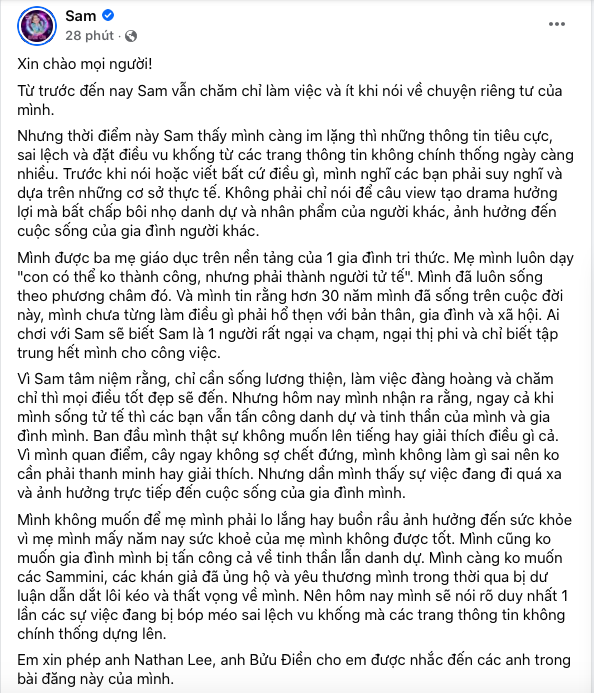 Sam đã định im lặng đến cùng nhưng càng im lặng Sam và gia đình Sam càng bị tổn thương nhiều hơn. Xin mọi người hãy để cho gia đình Sam được yên, xin mọi người hãy để cho Sam được làm 1 người con có hiếu. Một lần nữa, Sam mong muốn kết thúc câu chuyện ồn ào này tại đây. Xin lỗi mọi người vì đã làm phiền".