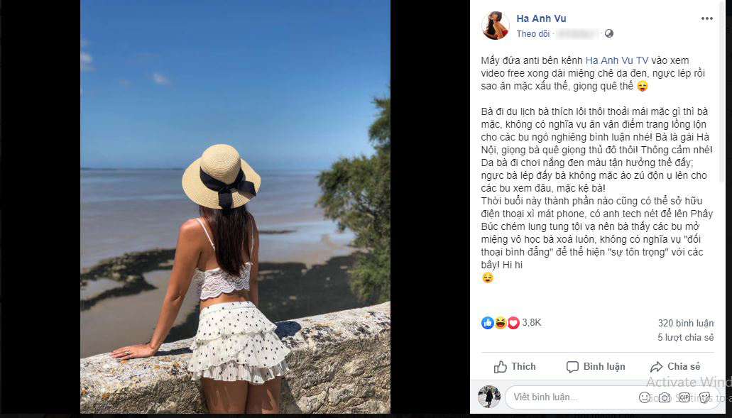 Không thể để yên cho antifan "hoành hành", mới đây, Hà Anh đã có những lời đáp trả khá gay gắt trên trang cá nhân của mình: "Mấy đứa anti bên kênh Ha Anh Vu TV vào xem video free xong dài miệng chê da đen, ngực lép rồi sao ăn mặc xấu thế, giọng quê thế.