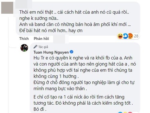 Tuấn Hưng đáp trả lời chê: “Em có quyền không nghe và ra khỏi Facebook của anh. Anh và con người của anh tạo nên giọng hát của anh, nó không phù hợp với tai nghe của em thì chúng ta không cùng một hướng. Đừng ở chỗ đông người tạo nghiệp làm gì cho tự mình mang bực vào thân. Em chỉ cố tạo ra một cái nick ảo rồi tìm cách tăng tương tác. Đó không phải là cách kiếm sống tốt. Bỏ đi”. Nam ca sĩ còn nhắn thủ H.T: “Em không hiểu ý anh gì cả. Em chê cũng nên lựa lời mà nói cho vừa lòng nhau. Chứ một lời góp ý hơn trăm ngàn lời khen. Anh hiểu đạo lý mà”.