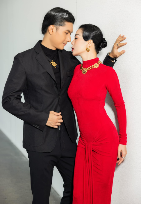 Nữ ca sĩ với trang phục màu đỏ nổi bật khi kết hợp với bộ vest đen của bạn trai. Đồng thời, cả hai cũng có những màn tạo dáng vô cùng tình tứ.