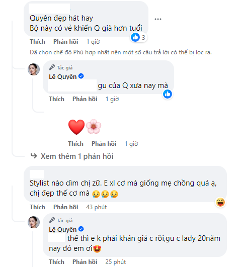 Tất nhiên, Lệ Quyên cũng thoải mái đón nhận những ý kiến trái chiều từ cộng đồng mạng nhưng không đặt nặng việc đó mà thay đổi phong cách của mình. Màn đối đáp trên với fan được xem là một ví dụ tiêu biểu nhất.