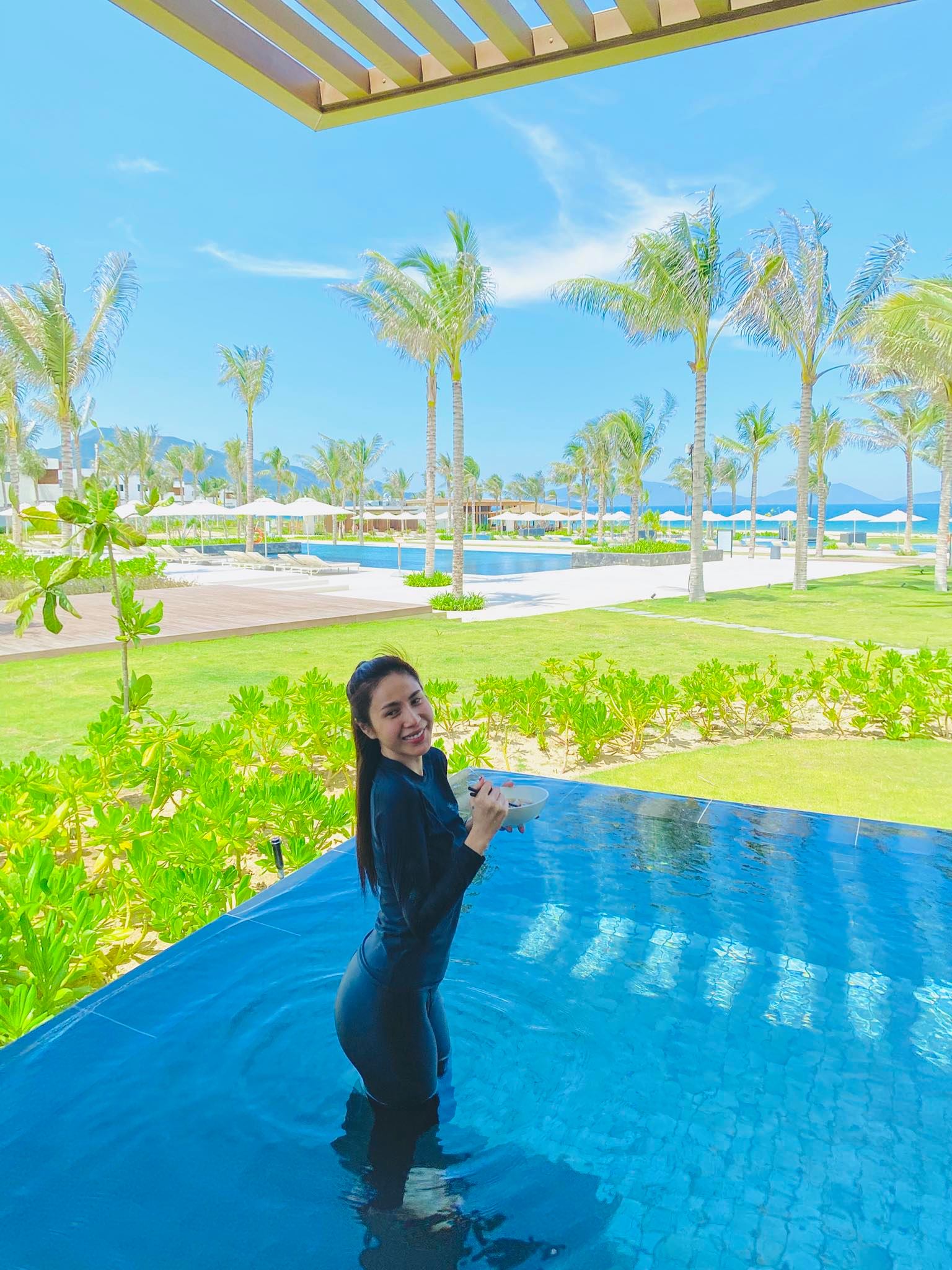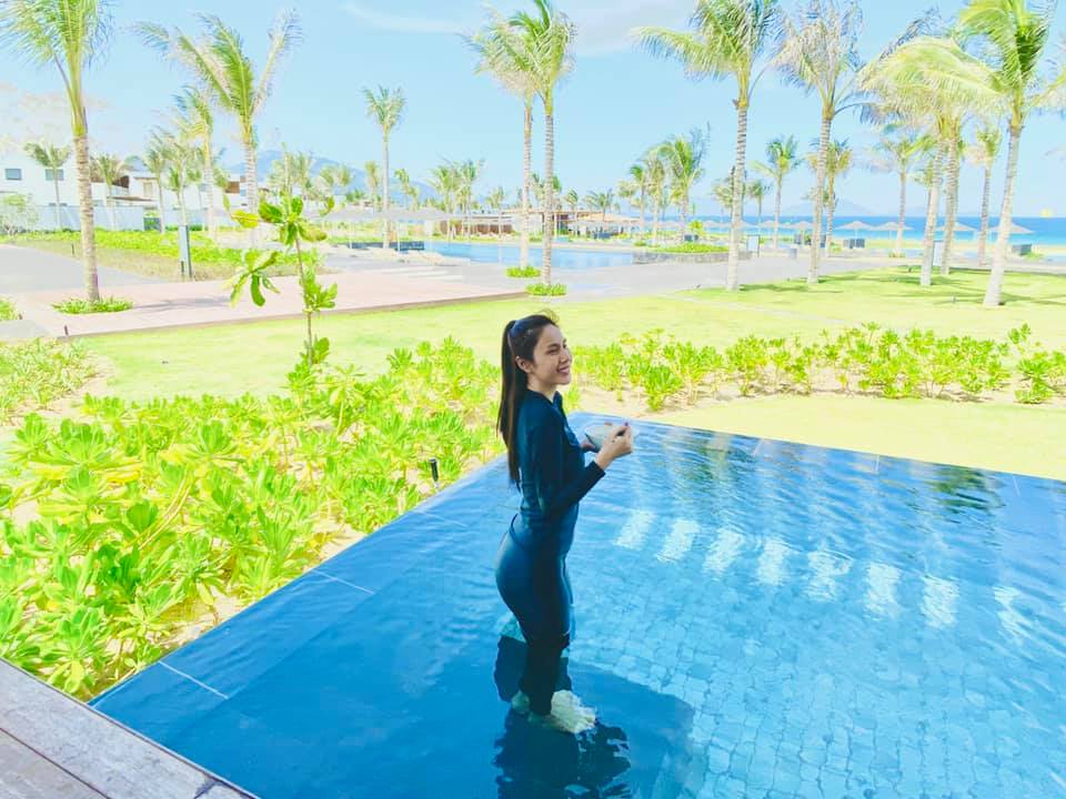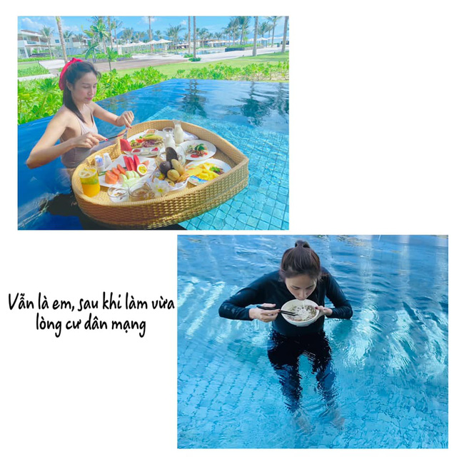 Cô nàng chia sẻ: "Sau khi nhận lời góp ý từ cư dân mạng comment là mặc đồ bơi xuống hồ bơi ăn sáng là phản cảm, với tinh thần cầu thị em đã mặc quần dài áo tay dài xuống hồ bơi ăn phở theo yêu cầu của quý cư dân mạng. Thấy đẹp hông mọi người, vừa lòng thì khen 1 tiếng cho em biết ý nhé".
