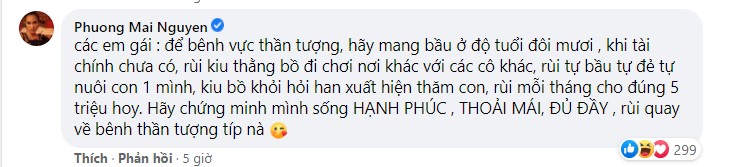 Trước phản ứng trái chiều này, MC Phương Mai đã nhanh chóng lên tiếng phản hồi. Ngay dưới status gây tranh cãi, cô viết: "Bố có tiền mua đồ hiệu mà để con mình và mẹ của con mình phải chật vật là sống lỗi quá rồi", "Các em gái: Để bênh vực thần tượng, hãy mang bầu ở độ tuổi đôi mươi khi tài chính chưa có, rồi kêu thằng bồ đi chơi nơi khác với các cô khác, rồi tự bầu tự đẻ tự nuôi con 1 mình, kêu bồ khỏi hỏi han xuất hiện thăm con, rồi mỗi tháng cho đúng 5 triệu. Hãy chứng minh mình sống HẠNH PHÚC , THOẢI MÁI, ĐỦ ĐẦY, rồi quay về bênh thần tượng tiếp nè", "Loại đàn ông vô trách nhiệm trên đời rất nhiều và phải bị lên án. Phụ nữ quá khổ rồi không cần khổ hơn nha em!".