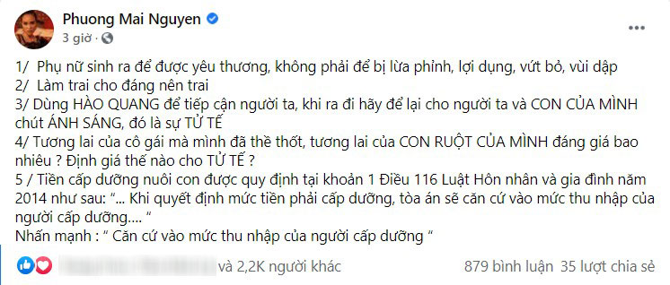 Cụ thể, cô viết trên trang cá nhân: "1 hộp sữa gần 900 ngàn 1 tuần 2 hộp, 1 tháng khoảng 7 triệu tiền sữa. 1 túi bỉm gầm 400 ngàn, 1 tuần 2 túi, 1 tháng khoảng 2 triệu tiền bỉm. 5 triệu 1 tháng tiền nuôi con thì mua bỉm hay mua sữa giờ". Dù không trực tiếp nêu tên nhưng trong những cuộc trò chuyện với bạn bè dưới phần bình luận, MC Phương Mai cũng ngầm khẳng định cô đang ám chỉ đến ồn ào của Jack, thậm chí thẳng thừng tuyên bố giọng ca Hồng nhan "sống lỗi".