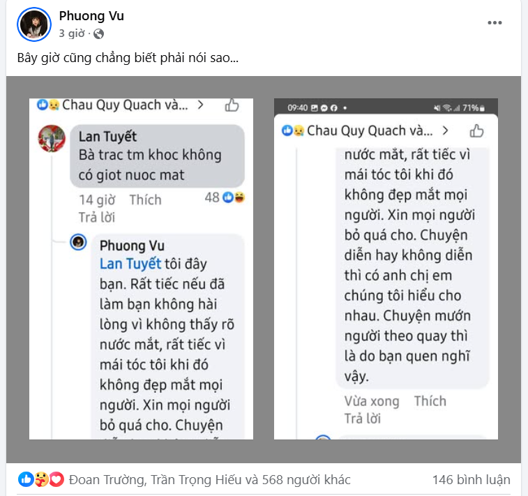 Nữ MC vào trả lời: “Tôi đây bạn. Rất tiếc nếu đã làm bạn không hài lòng vì không thấy rõ nước mắt, rất tiếc vì mái tóc tôi khi đó không đẹp mắt mọi người. Xin mọi người bỏ quá cho. Chuyện diễn hay không diễn thì chỉ có anh chị em chúng tôi hiểu cho nhau. Chuyện mướn người theo quay thì là do bạn quen nghĩ vậy”.