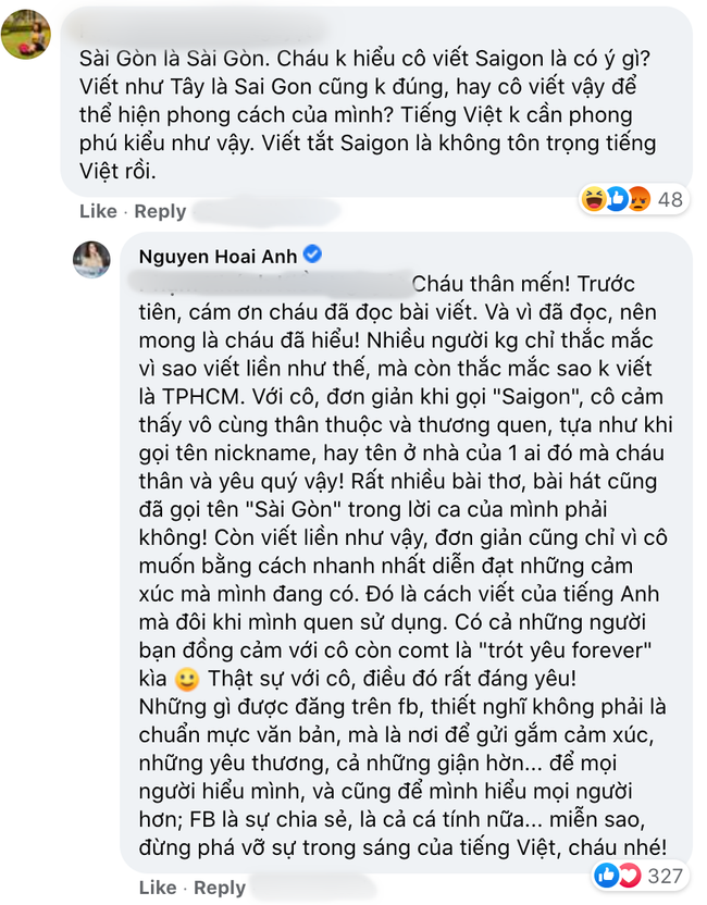 Theo người này, BTV Hoài Anh viết Sài Gòn thành Saigon là "tây hoá", "không tôn trọng tiếng Việt". Trước phản ứng của dân mạng, nữ BTV xinh đẹp đã thẳng thắn bày tỏ quan điểm của mình. Cô cho biết đây là cách gọi thân thương của mình dành cho TP.HCM. Cô xem Sài Gòn như nhà, mà người nhà thì thường gọi biệt danh.