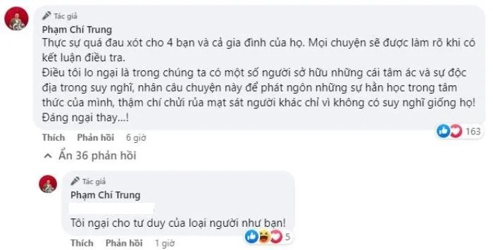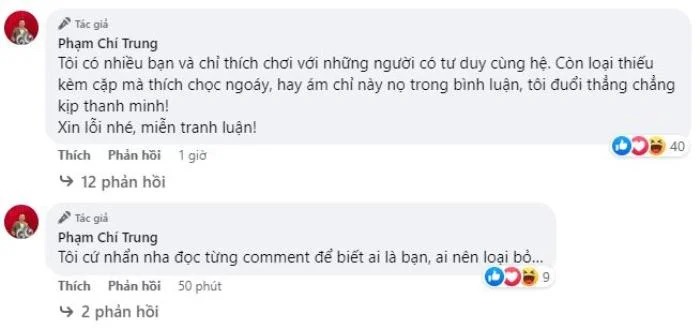 Vấp phải "cơn mưa gạch đá" từ dư luận, NS Chí Trung sau đó đã có màn "phản pháo" cực gắt ngay dưới bài viết của mình. Anh thẳng thắn chia sẻ: "Tôi có nhiều bạn và chỉ thích chơi với những người có tư duy cùng hệ. Còn loại thiếu kèm cặp mà thích chọc ngoáy, hay ám chỉ này nọ trong bình luận, tôi đuổi thẳng chẳng kịp thanh minh! Xin lỗi nhé, miễn tranh luận!". Nam nghệ sĩ còn cho biết đây chính là dịp để anh "lọc bạn" trên mạng xã hội: "Tôi cứ nhẩn nha đọc từng bình luận để biết ai là bạn, ai nên loại bỏ".