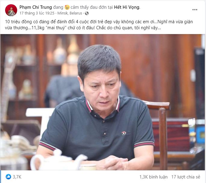 Trước sự việc này, NS Chí Trung đã nêu quan điểm cá nhân trên mạng xã hội. Nam nghệ sĩ bày tỏ cảm xúc "vừa giận vừa thương" sau khi biết tin 4 tiếp viên hàng không bị bắt vì vận chuyển ma túy: "10 triệu đồng có đáng để đánh đổi bốn cuộc đời trẻ đẹp vậy không các em ơi. Nghĩ mà vừa giận vừa thương 11,3kg ma túy chứ có ít đâu! Chắc do chủ quan, tôi nghĩ vậy".