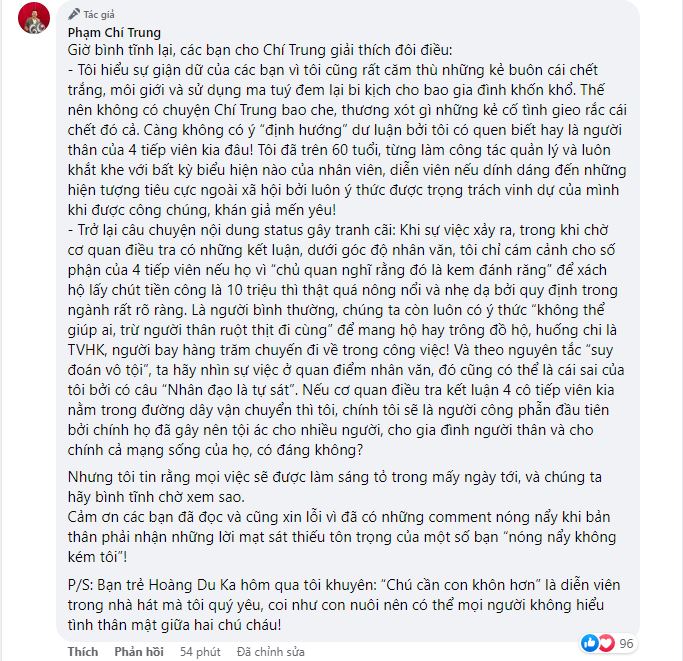 Tôi hiểu sự giận dữ của các bạn vì tôi cũng rất căm thù những kẻ buôn cái chết trắng, môi giới và sử dụng ma tuý đem lại bi kịch cho bao gia đình khốn khổ. Thế nên không có chuyện Chí Trung bao che, thương xót gì những kẻ cố tình gieo rắc cái chết đó cả. Càng không có ý 'định hướng' dư luận bởi tôi có quen biết hay là người thân của 4 tiếp viên kia đâu! Tôi đã trên 60 tuổi, từng làm công tác quản lý và luôn khắt khe với bất kỳ biểu hiện nào của nhân viên, diễn viên nếu dính dáng đến những hiện tượng tiêu cực ngoài xã hội bởi luôn ý thức được trọng trách vinh dự của mình khi được công chúng, khán giả mến yêu!