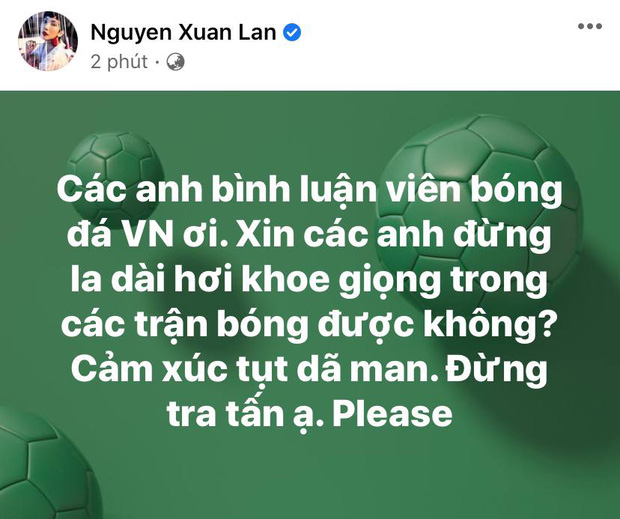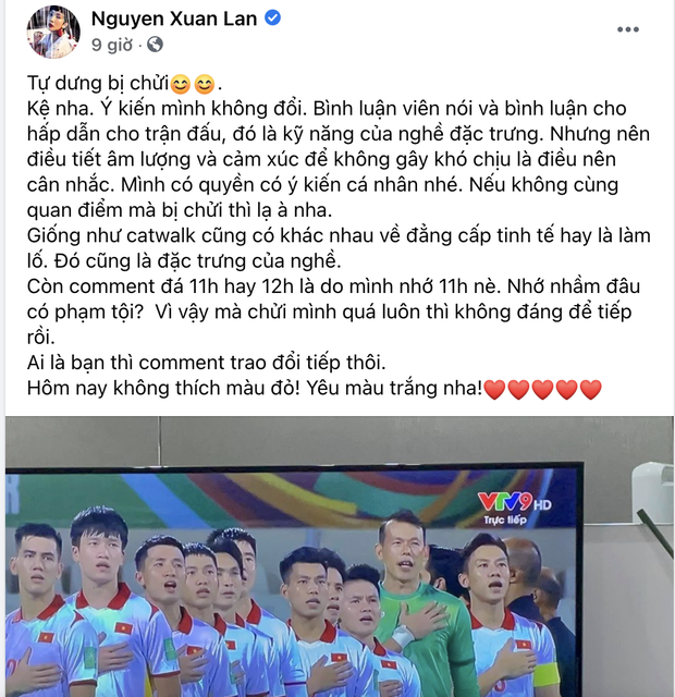 Trước loạt bàn tán của cư dân mạng, Xuân Lan đã lên tiếng đính chính. Trên trang cá nhân, cô bày tỏ: "Tự dưng bị chửi. Kệ nha. Ý kiến mình không đổi. Bình luận viên nói và bình luận cho hấp dẫn cho trận đấu, đó là kỹ năng của nghề đặc trưng. Nhưng nên điều tiết âm lượng và cảm xúc để không gây khó chịu là điều nên cân nhắc. Mình có quyền có ý kiến cá nhân nhé. Nếu không cùng quan điểm mà bị chửi thì lạ à nha.