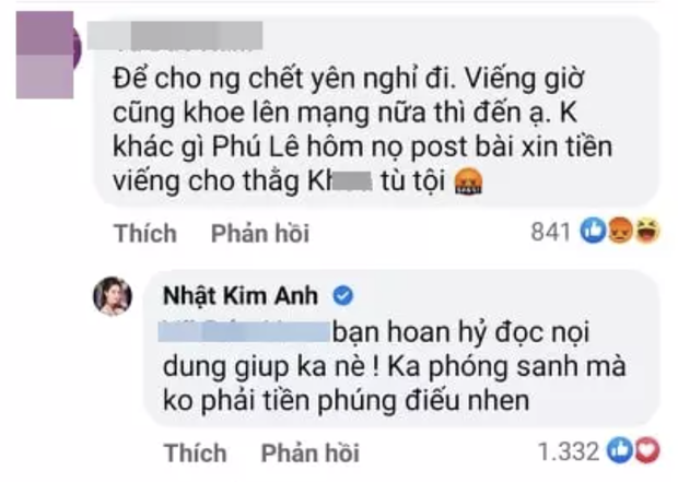 Cụ thể, một netizen đã để lại bình luận vô cùng kém duyên: "Để cho người chết yên nghỉ đi, viếng giờ cũng khoe lên mạng nữa thì đến ạ". Trước bình luận này, nữ ca sĩ đã lên tiếng trả lời: "Bạn hoan hỷ đọc nội dung giúp Kim Anh nhé. Kim Anh phóng sinh, không phải tiền phúng điếu". Sau đó, một số khán giả cũng lên tiếng bênh vực và cho rằng hành động của Nhật Kim Anh là đáng quý, không hề có ý đồ gì.