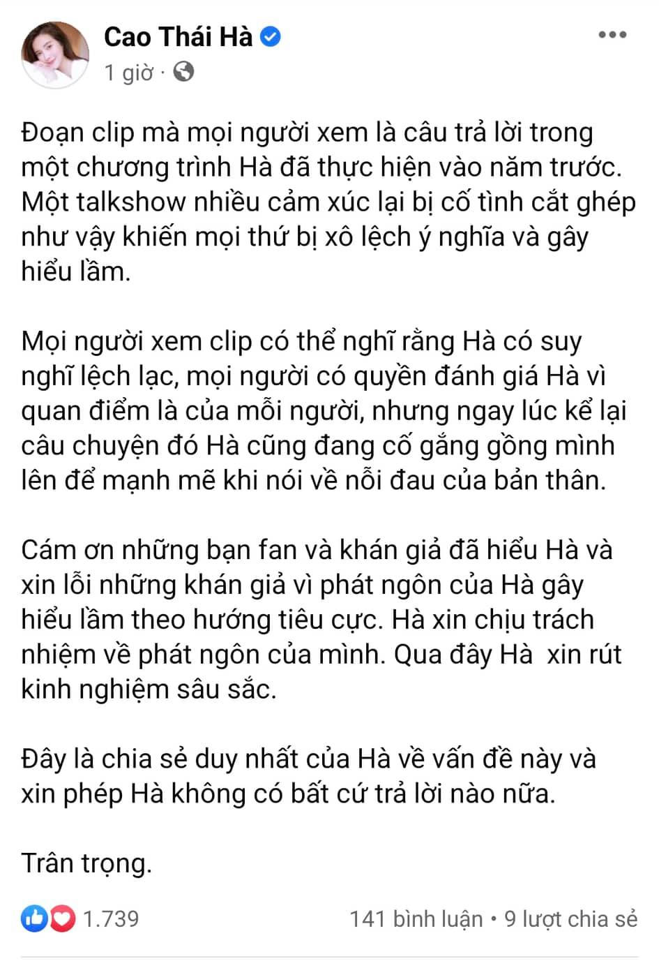 "Đoạn clip mà mọi người xem là câu trả lời trong một chương trình Hà đã thực hiện vào năm trước. Một talkshow nhiều cảm xúc lại bị cố tình cắt ghép như vậy khiến mọi thứ bị xô lệch ý nghĩa và gây hiểu lầm.