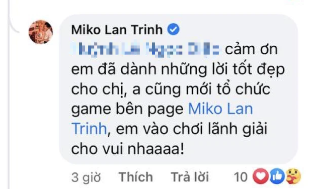 Cho đến mới đây, khi có netizen hỏi: "Ai biết Miko Lan Trinh là ai không. Thấy toàn PR vì yêu chuyển giới không", đích thân Miko Lan Trinh đã vào đáp trả. Tuy nhiên, thay vì phân trần chuyện PR, nữ ca sĩ lại mời antifan chơi game để trúng thưởng. Hành động này đã khiến nhiều người khen ngợi vì màn ứng xử cao tay của giọng ca Gạo Trắng Nước Trong.