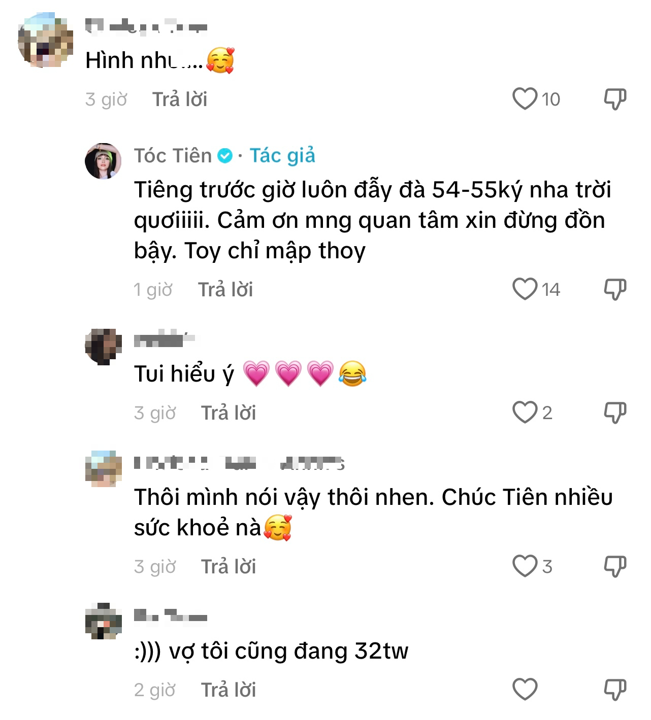 Tuy nhiên, cư dân mạng liền xôn xao cho rằng Tóc Tiên có sự thay đổi về ngoại hình, hiện tại đã tăng cân đáng kể. Dưới bài đăng, đông đảo netizen rộ nghi vấn ca sĩ 8x đang có tin vui. Tuy nhiên bà xã Hoàng Touliver đã phủ nhận và lên tiếng làm rõ: "Tiên trước giờ luôn đẫy đà 54-55kg nha trời ơi. Cảm ơn mọi người quan tâm, xin đừng đồn bậy. Tôi chỉ mập thôi".