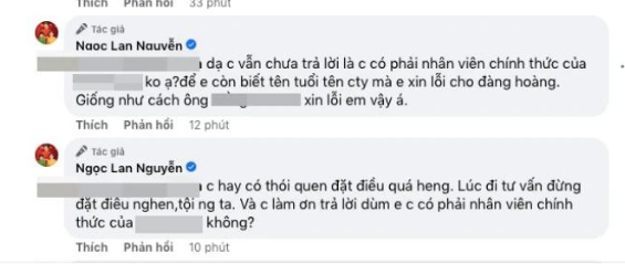 Trước phản ứng gay gắt của khán giả, Ngọc Lan đã đặt câu hỏi rằng người này có phải nhân viên chính thức của công ty P.H. hay không để qua xin lỗi theo yêu cầu. "Chị đòi em xin lỗi thì để em qua xin lỗi tận mặt. Chị không sợ thì chị trả lời giùm em là chị làm nhân viên chính thức của bảo hiểm P.H. hay không chính thức ạ. Chị hay có thói quen đặt điều quá heng. Lúc đi tư vấn đừng đặt điều nghen, tội người ta....", diễn viên Ngọc Lan nhắn nhủ.