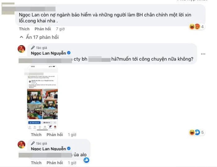 Dù ồn ào về vấn đề bảo hiểm của Ngọc Lan đã được giải quyết nhưng nhiều khán giả vẫn bàn tán câu chuyện của diễn viên Ngọc Lan trên mạng xã hội. Mới đây nhất trên trang cá nhân, một khán giả đã bất ngờ để lại bình luận bên dưới bài đăng của diễn viên Ngọc Lan với nội dung: "Ngọc Lan còn nợ ngành bảo hiểm và những người làm bảo hiểm chân chính một lời xin lỗi công khai nha". Trước bình luận này, diễn viên Ngọc Lan đã không khỏi bất ngờ: "Ủa alo... Công ty bảo hiểm P.H. hả? Muốn tới công chuyện nữa không?".