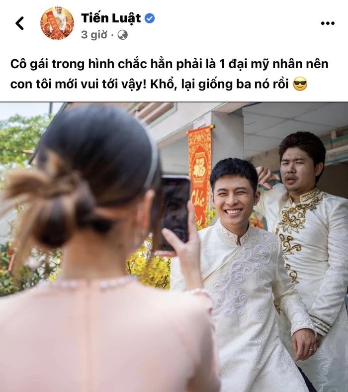 Cụ thể, Puka đang trổ tài phó nháy cho “tình tin đồn”, còn đàng trai nhìn bạn gái với ánh mắt đầy tình tứ. Tiến Luật viết: “Cô gái trong hình chắc hẳn phải là 1 đại mỹ nhân nên con tôi mới vui tới vậy! Khổ, lại giống ba nó rồi”. Ngay phía dưới, Gin Tuấn Kiệt để lại bình luận: “Con cũng chỉ học tập theo ba để có được đại mỹ nhân như mẹ Thu Trang thôi mà”.