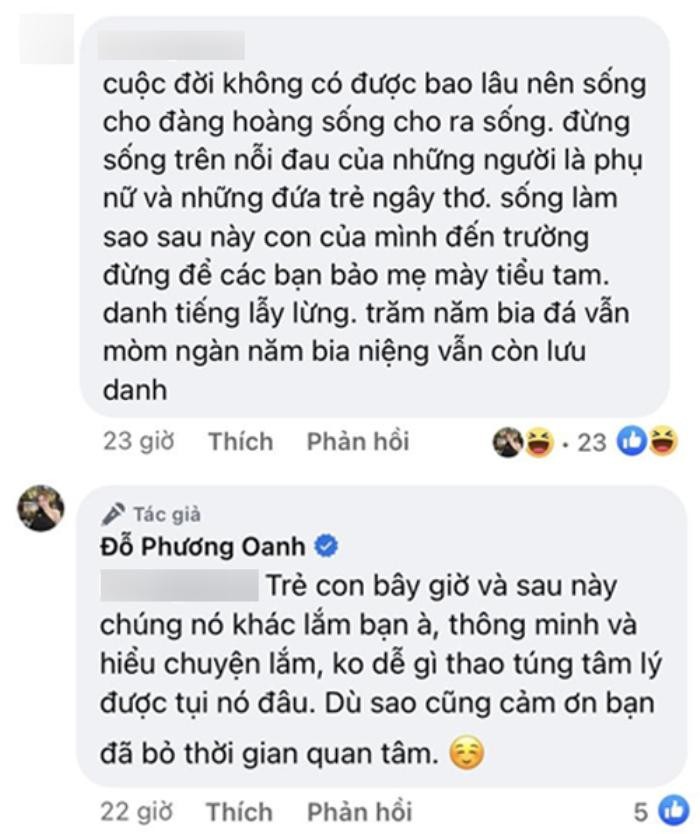 Trước ý kiến trên, Phương Oanh nhanh chóng đáp trả: "Trẻ con bây giờ và sau này khác lắm bạn à. Thông minh và hiểu chuyện lắm, không dễ gì thao túng được tâm lý tụi nó đâu. Dù sao cũng cảm ơn bạn đã bỏ thời gian quan tâm".