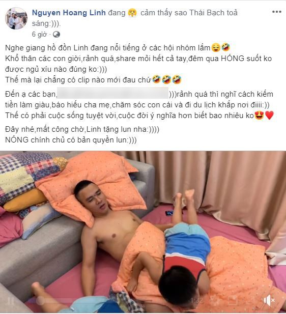 "Nghe giang hồ đồn Linh đang nổi tiếng ở các hội nhóm lắm. Khổ thân các con giời, rảnh quá, share mỏi hết cả tay, đêm qua hóng suốt không được ngủ xíu nào đúng không? Thế mà lại chẳng có clip nào mới đau chứ.