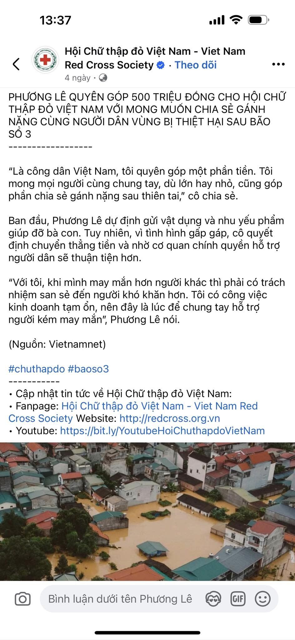 Trước những thông tin này, chiều ngày 14/9, Phương Lê bất ngờ chia sẻ lời cảm ơn của Hội Chữ thập đỏ Việt Nam vì đã đóng góp 500.000.000 đồng cho hoạt động cứu trợ đồng bào bị bão lụt trong cơn bão số 3.
