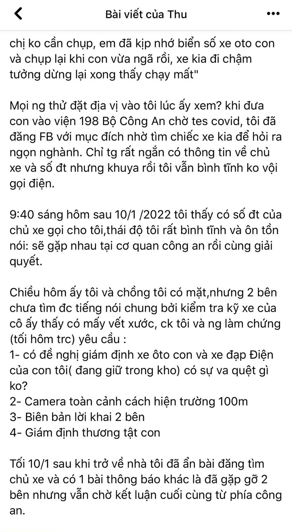 Tối 10/1 sau khi trở về nhà tôi đã ẩn bài đăng tìm chủ xe và có 1 bài thông báo khác là đã gặp gỡ 2 bên nhưng vẫn chờ kết luận cuối cùng từ phía công an".
