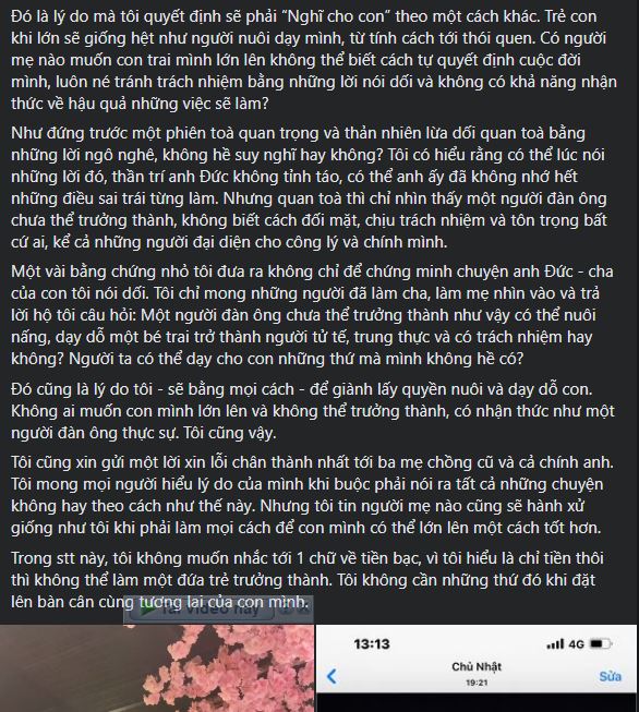 Một vài bằng chứng nhỏ tôi đưa ra không chỉ để chứng minh chuyện anh Đức - cha của con tôi nói dối. Tôi chỉ mong những người đã làm cha, làm mẹ nhìn vào và trả lời hộ tôi câu hỏi: Một người đàn ông chưa thể trưởng thành như vậy có thể nuôi nấng, dạy dỗ một bé trai trở thành người tử tế, trung thực và có trách nhiệm hay không? Người ta có thể dạy cho con những thứ mà mình không hề có?