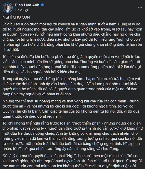 Tôi cũng xin gửi một lời xin lỗi chân thành nhất tới ba mẹ chồng cũ và cả chính anh. Tôi mong mọi người hiểu lý do của mình khi buộc phải nói ra tất cả những chuyện không hay theo cách như thế này. Nhưng tôi tin người mẹ nào cũng sẽ hành xử giống như tôi khi phải làm mọi cách để con mình có thể lớn lên một cách tốt hơn.