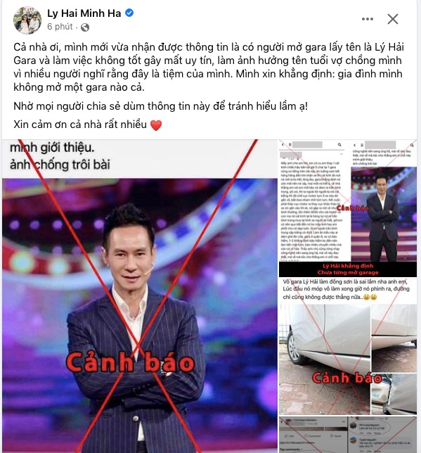 Nguyên văn bài đăng của Lý Hải như sau: "Cả nhà ơi, mình mới vừa nhận được thông tin là có người mở gara lấy tên là Lý Hải Gara và làm việc không tốt gây mất uy tín, làm ảnh hưởng tên tuổi vợ chồng mình vì nhiều người nghĩ rằng đây là tiệm của mình. Mình xin khẳng định: Gia đình mình không mở một gara nào cả. Nhờ mọi người chia sẻ dùm thông tin này để tránh hiểu lầm ạ! Xin cảm ơn cả nhà rất nhiều".