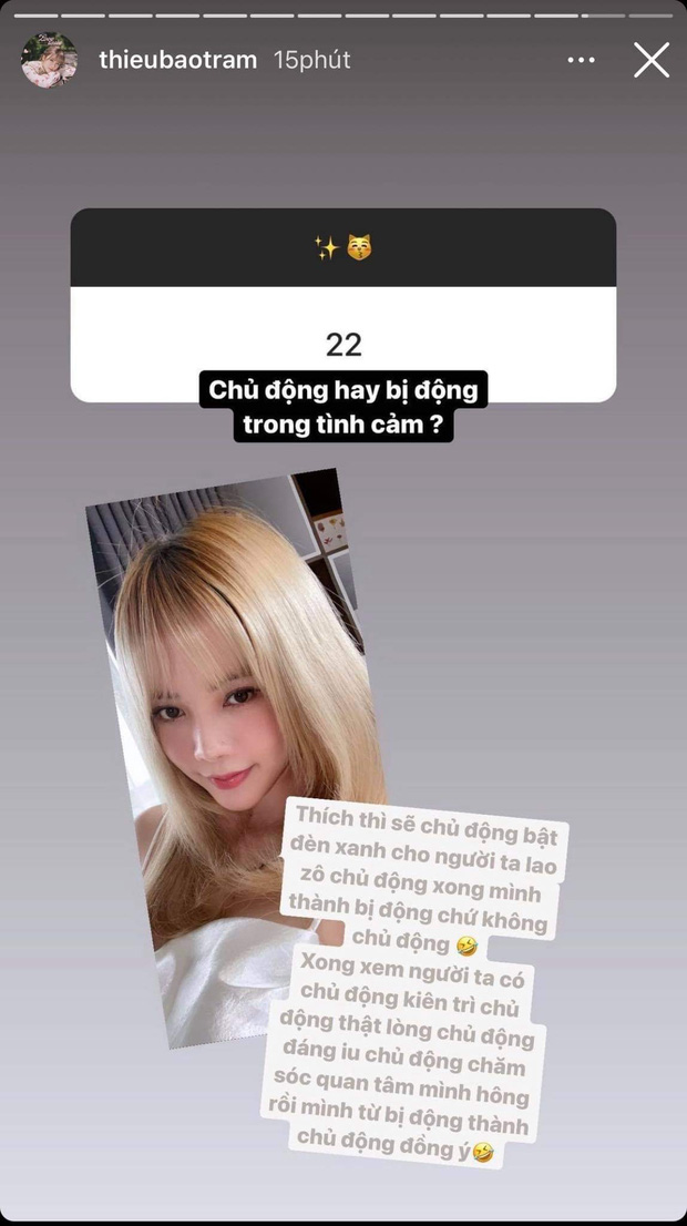 Mấy ngày nay, cõi mạng rần rần chuyện anh chủ tịch chia tay vì không chịu được cô bạn gái ca sĩ "đào mỏ", tiêu hoang, tính cách khó chiều. Ngay lập tức bộ 3 nhân vật trong drama "trà xanh" bị netizen gọi tên. Lần nữa bị réo vào lùm xùm tình ái, Hải Tú và chủ tịch Sơn Tùng vẫn giữ thái độ im lặng còn Thiều Bảo Trâm đều đặn "thả thính" và mở luôn Q&A để giải đáp thắc mắc của người hâm mộ.