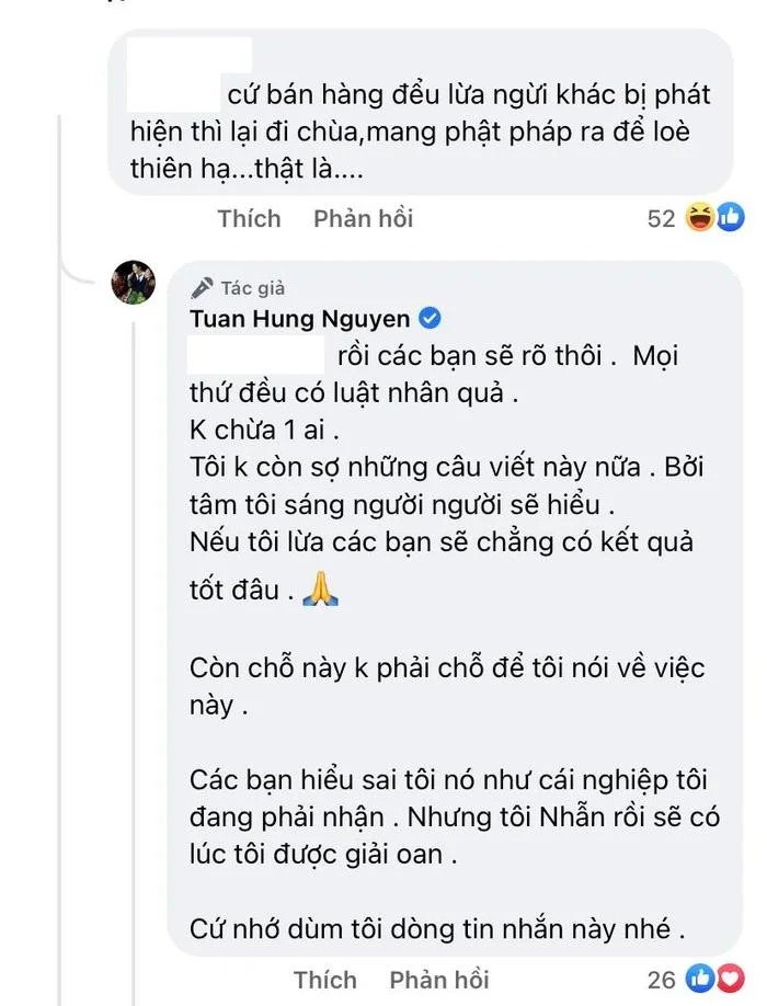 Đứng trước ý kiến này, Tuấn Hưng ngay lập tức lên tiếng: "Rồi các bạn sẽ rõ thôi. Mọi thứ đều có luật nhân quả không chừa một ai. Tôi không còn sợ những câu viết này nữa, bởi tâm tôi sáng người người sẽ hiểu. Nếu tôi lừa các bạn sẽ chẳng có kết quả tốt đâu, còn chỗ này k phải chỗ để tôi nói về việc này. Các bạn hiểu sai tôi nó như cái nghiệp tôi đang phải nhận, nhưng tôi nhẫn rồi sẽ có lúc tôi được giải oan. Cứ nhớ dùm tôi dòng tin nhắn này nhé".
