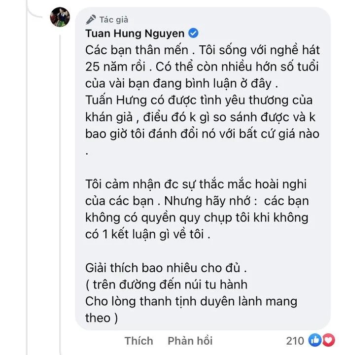 Bên cạnh đó Tuấn Hưng cho rằng khó có thể giải thích sao cho đủ: "Các bạn thân mến, tôi sống với nghề hát 25 năm rồi. Có thể còn nhiều hớn số tuổi của vài bạn đang bình luận ở đây. Tuấn Hưng có được tình yêu thương của khán giả, điểu đó không gì so sánh được và không bao giờ tôi đánh đổi nó với bất cứ giá nào. Tôi cảm nhận được sự thắc mắc hoài nghi của các bạn. Nhưng hãy nhớ các bạn không có quyền quy chụp tôi khi không có một kết luận gì về tôi".