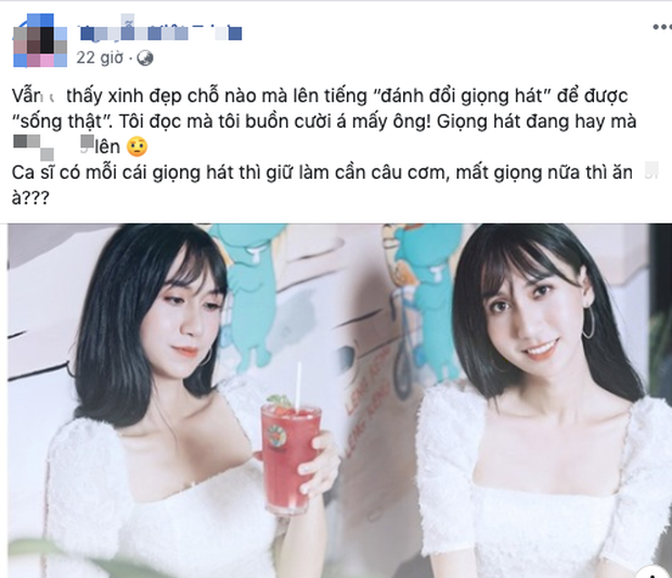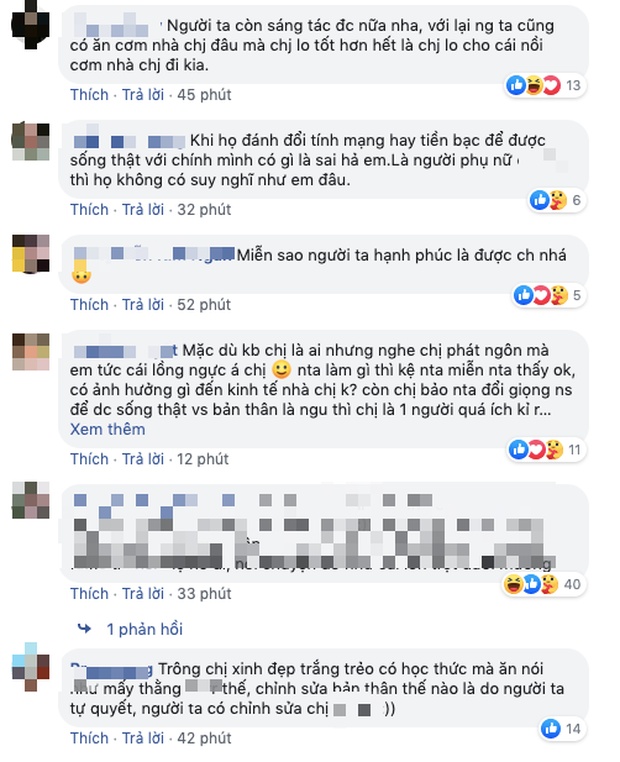 "Vẫn không thấy xinh đẹp chỗ nào mà lên tiếng đánh đổi giọng hát để được sống thật. Tôi đọc mà mà tôi buồn cười á mấy ông. Giọng hát đang hay mà ***. Ca sĩ có mỗi cái giọng hát thì giữ làm cần câu cơm, mất giọng nữa thì ***?", người này viết.