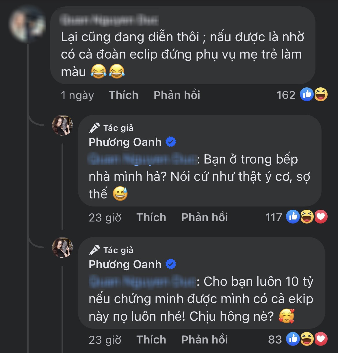 Ngay lập tức, Phương Oanh đã có bình luận đáp trả, đồng thời thách thức chủ bình luận trên chứng minh việc nấu ăn của mình không phải là thực tế: "Bạn ở trong bếp nhà mình hả, nói cứ như thật ý cơ, sợ thế. Cho bạn luôn 10 tỷ nếu chứng minh được mình có cả ekip này nọ luôn nhé! Chịu không nè!"