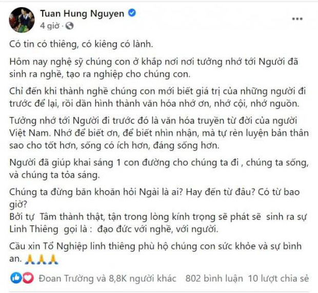 Trên trang cá nhân của mình, Tuấn Hưng cũng có chia sẻ gây chú ý: "Có tin có thiêng, có kiêng có lành. Hôm nay nghệ sỹ chúng con ở khắp nơi nơi tưởng nhớ tới Người đã sinh ra nghề, tạo ra nghiệp cho chúng con. Chỉ đến khi thành nghề chúng con mới biết giá trị của những người đi trước để lại, rồi dần hình thành văn hóa nhớ ơn, nhớ cội, nhớ nguồn. Tưởng nhớ tới Người đi trước đó là văn hóa truyền từ đời của người Việt Nam..."
